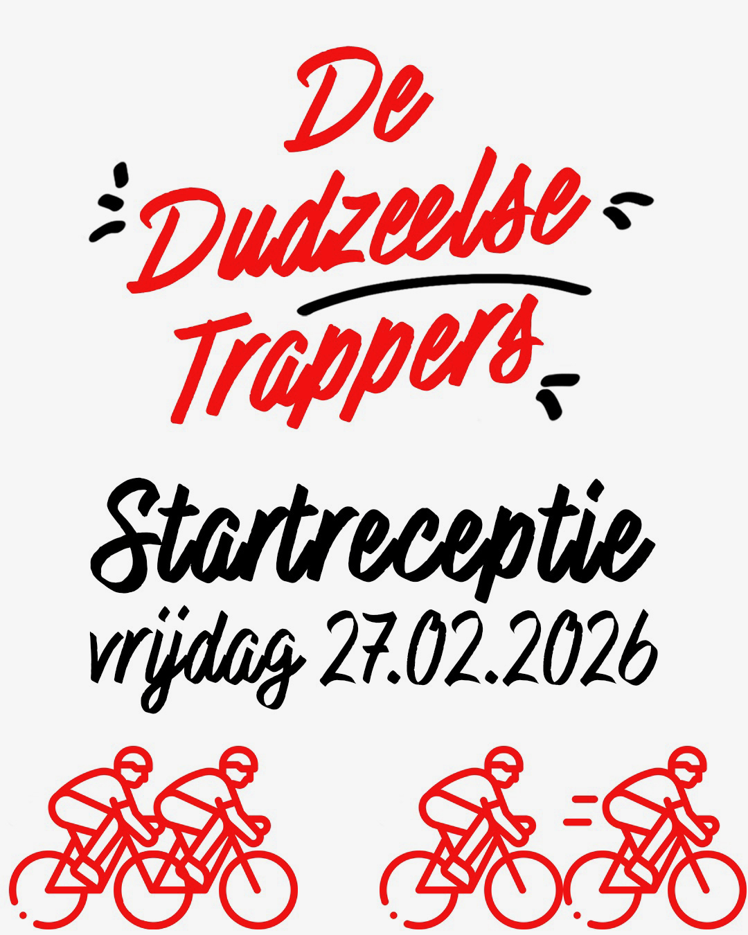 🚴♂️🥂 De Dudzeelse Trappers trappen het nieuwe seizoen op gang! Op vrijdag 27.02.2026 (19u–23u) nodigen we jullie van harte uit op onze startreceptie in de Mancave van Freddy (Dudzeels Opperhof 19, 8380 Dudzele). Samen klinken we op een sportief, gezellig en succesvol nieuw wielerseizoen! 🍾✨ Leden, nieuwe gezichten en partners: iedereen is welkom! 👉 Interesse om lid te worden? Kom gerust langs en maak kennis met onze club! 📩 Graag inschrijven vóór 20.02 via dedudzeelsetrappers@gmail.com (met vermelding van het aantal personen). We kijken ernaar uit om samen het seizoen feestelijk in te zetten! Tot dan! 👋🚴♀️