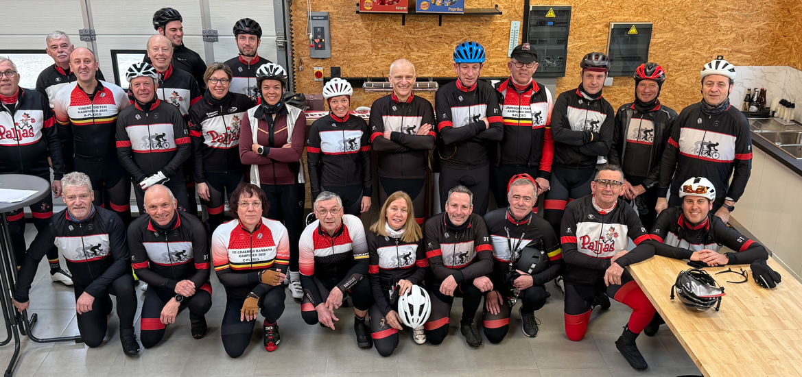 Traditie is traditie: vlak voor de eerste rit van het seizoen verzamelden we in de mancave van Freddy voor de jaarlijkse groepsfoto. Iedereen goed ingeduffeld, want met een frisse 10°C was het geen weer voor korte mouwen. 🥶🚴‍♂️ Maar de goesting om opnieuw samen de baan op te gaan was duidelijk groter dan de kou! Ploeg 1 trok richting Aardenburg, ploeg 2 zette koers naar Waardamme. De laagjes waren talrijk, de sfeer zat goed en het nieuwe seizoen is officieel afgetrapt!